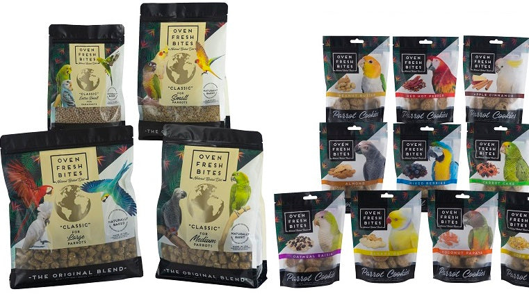 All Oven Fresh Bites parrot food contains natural ingredients sourced in the USA and are selected according to nutritious properties, quality, and appeal to the preferences of specific and exotic parrots. Each of these natural gourmet ingredients provides a specific nutritious benefit to your pet parrot.