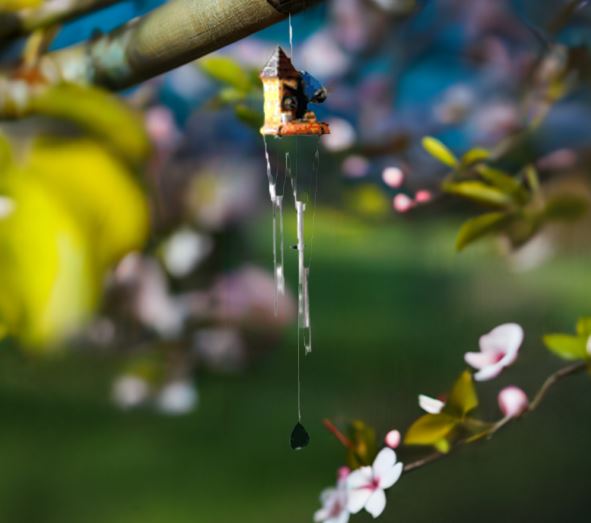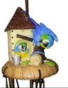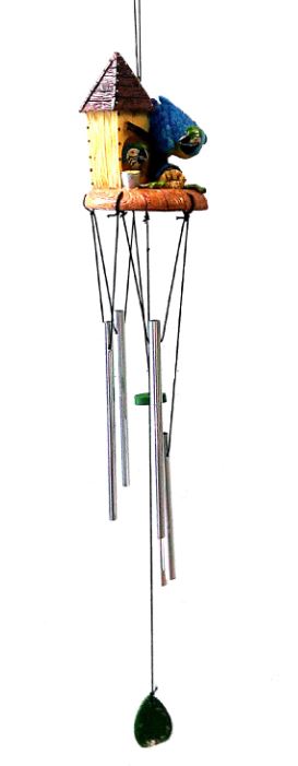 Hand painted resin birdhouse with a pair of Blue and Gold Macaws atop wind chime. Wind chime measures approximately 18 inches in total length. Resin birdhouse measures about 3-1/2 across and is about 4-1/4 inches tall. With metal tubes, chime has a delicate lovely sound. Can be used indoors or in a protected area outdoors.