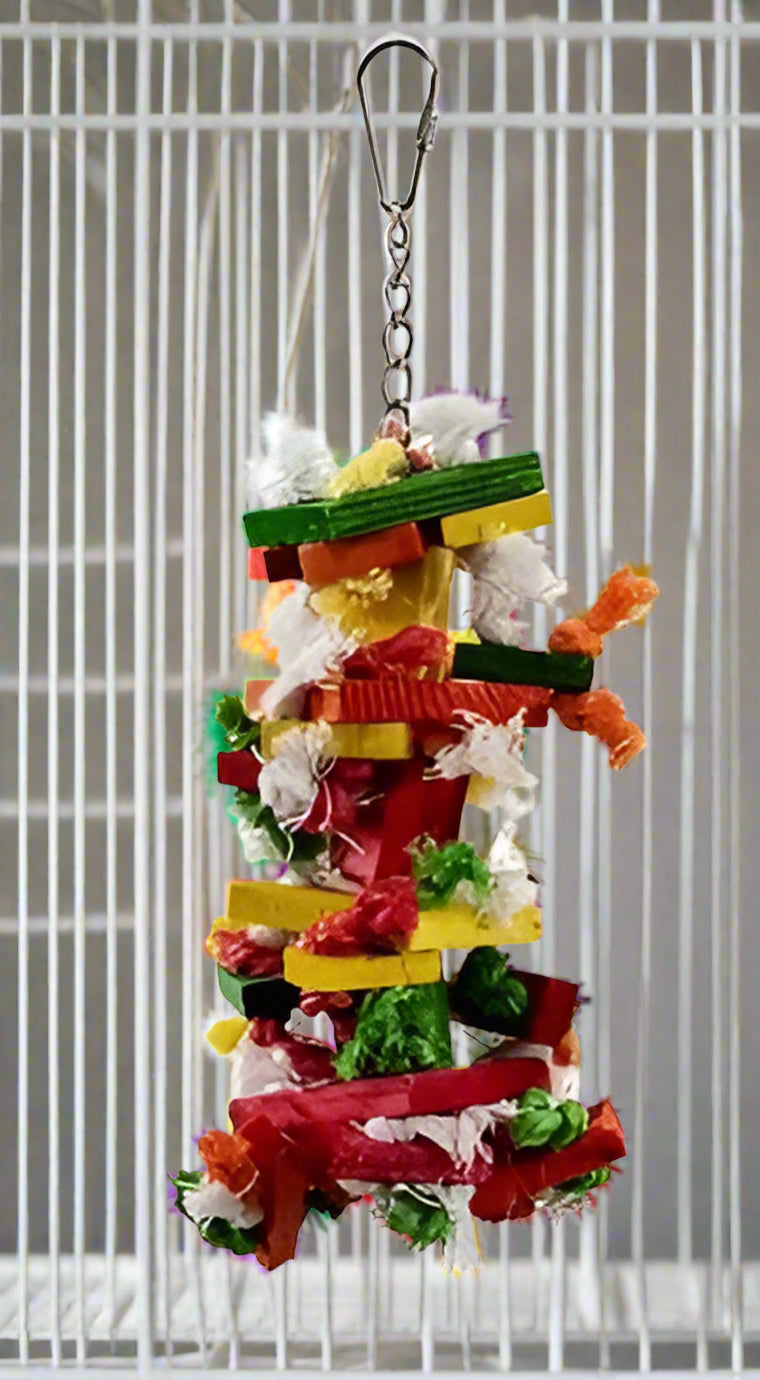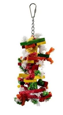 The Small size Knots N Blocks hanging bird toy is for small to medium size birds who love to chew. The colorful wooden different shaped thick pieces are a perfect size. The cotton rope and sisal rope that these wooden pieces are strung on can also provide an excellent opportunity for preening and keeping those smaller beaks busy.