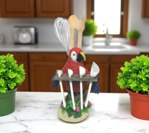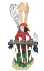 Detailed resin red macaw parrot stands approximately 9-1/2 inches tall and holds three 10 inch size wooden spoon and fork utensils, and one wire whisk.