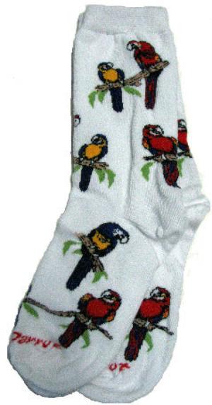 Macaw Parrot design with lots of Scarlet and Blue and Gold macaws on a white sock with "Calypso Parrot" printed on the toe area.