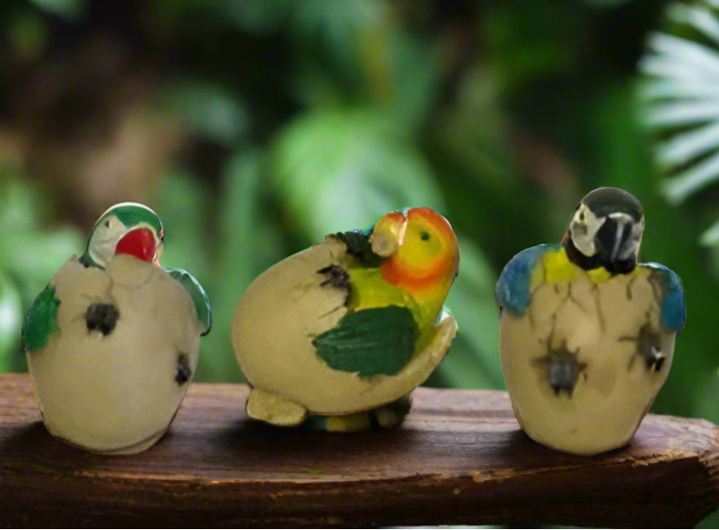 Hand-painted Parrot Hatchlings are made of resin. Blue and Green Parrot Hatchlings measure approximately 3-1/2 inches in height and approximately 2-3/4 inches wide. The Orange Hatchling measures approximately 3 inches in height and approximately 3-1/2 inches in width.