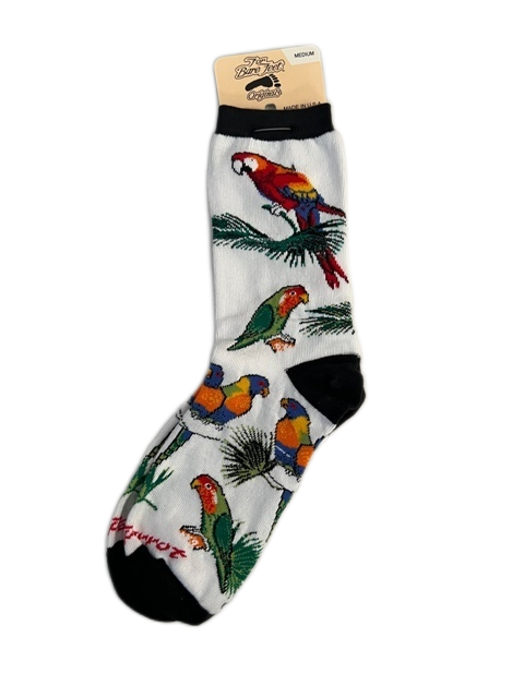 The Multiple Parrot design has several different species of brightly colored parrots which include colorful Rainbow Lorikeets, Red and Blue Macaws, and other parrots. Calypso Parrot is printed just above the toe area. These white with black-trim parrot socks are great for any parrot lover.