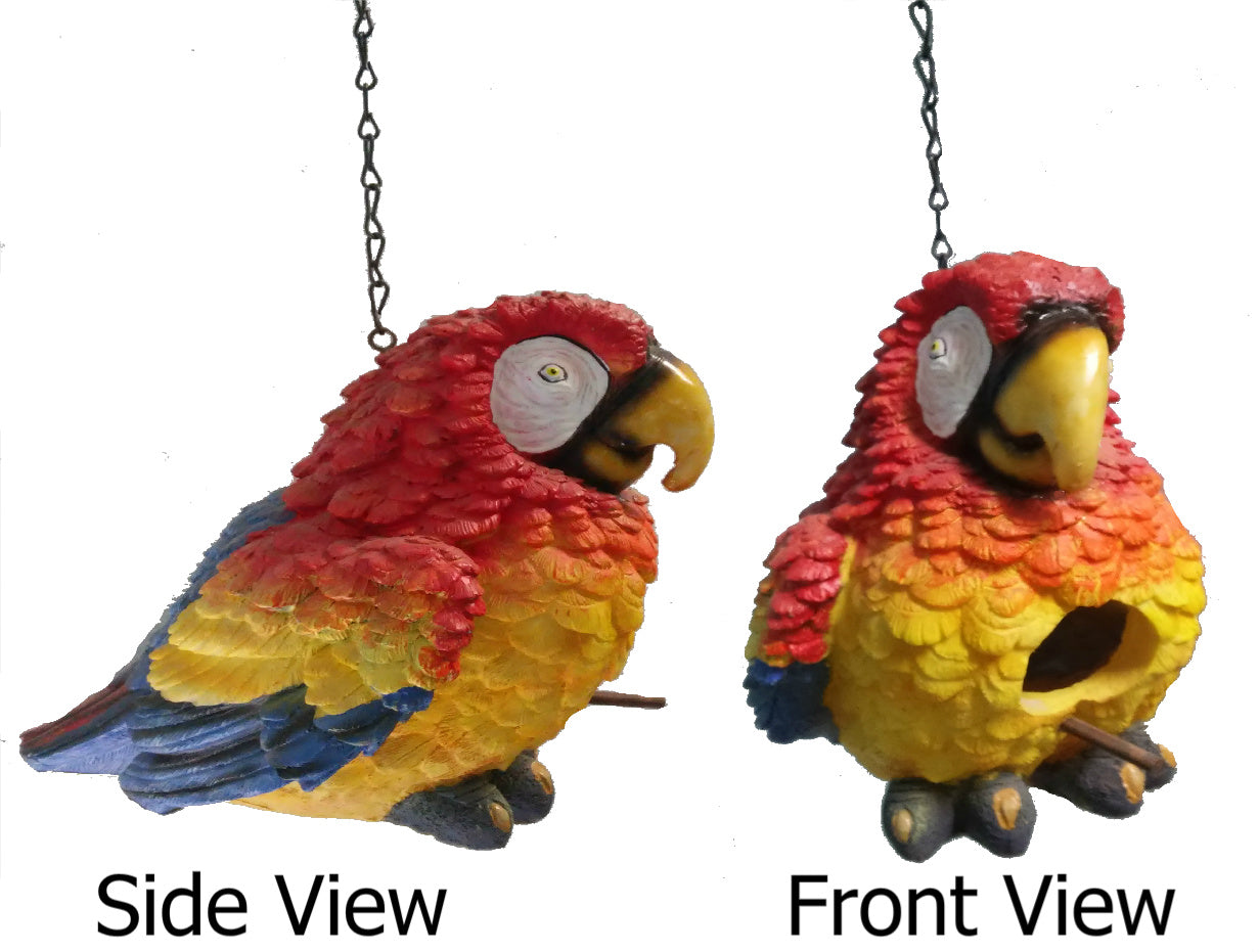 Beautifully detailed resin red scarlet macaw outdoor garden bird house. So cute and just perfect for small outdoor birds to set up a nest.
