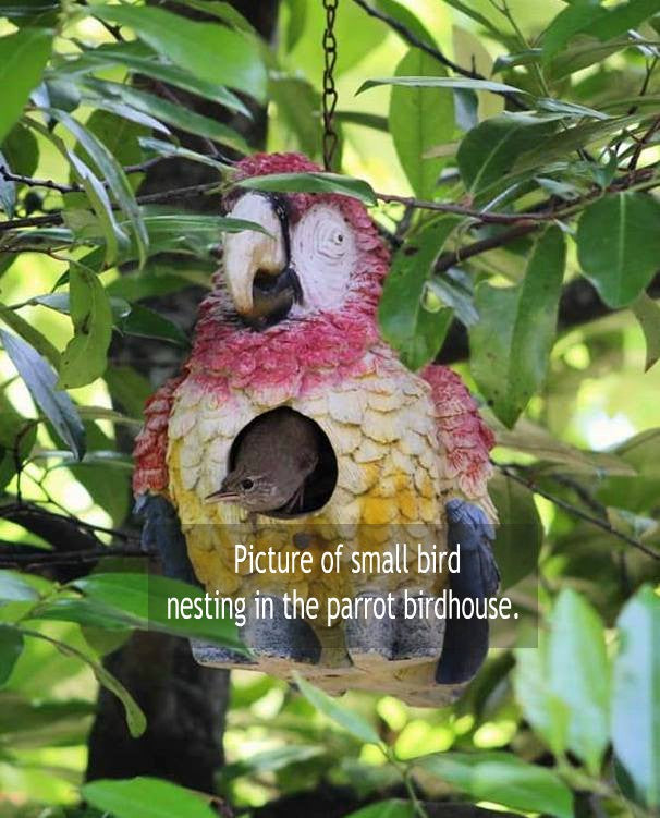 The parrot birdhouse comes with a metal chain for hanging and opening has a small perch for birds to sit and protect or feed babies inside.