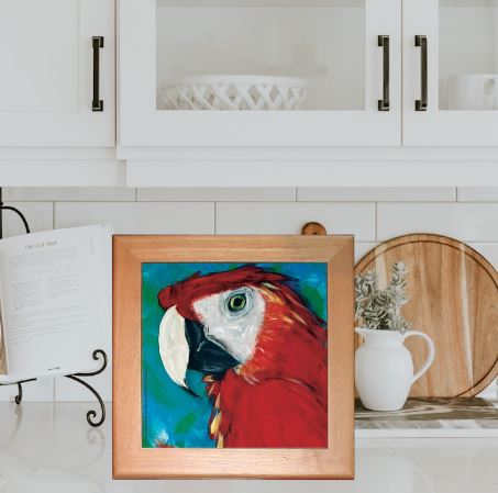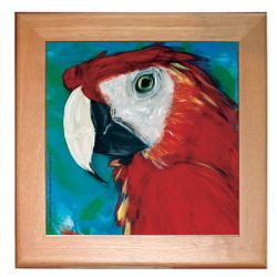 A Scarlet Macaw Parrot Ceramic Trivet or Hot Plate surrounded by a pinewood frame can also be displayed as wall art.