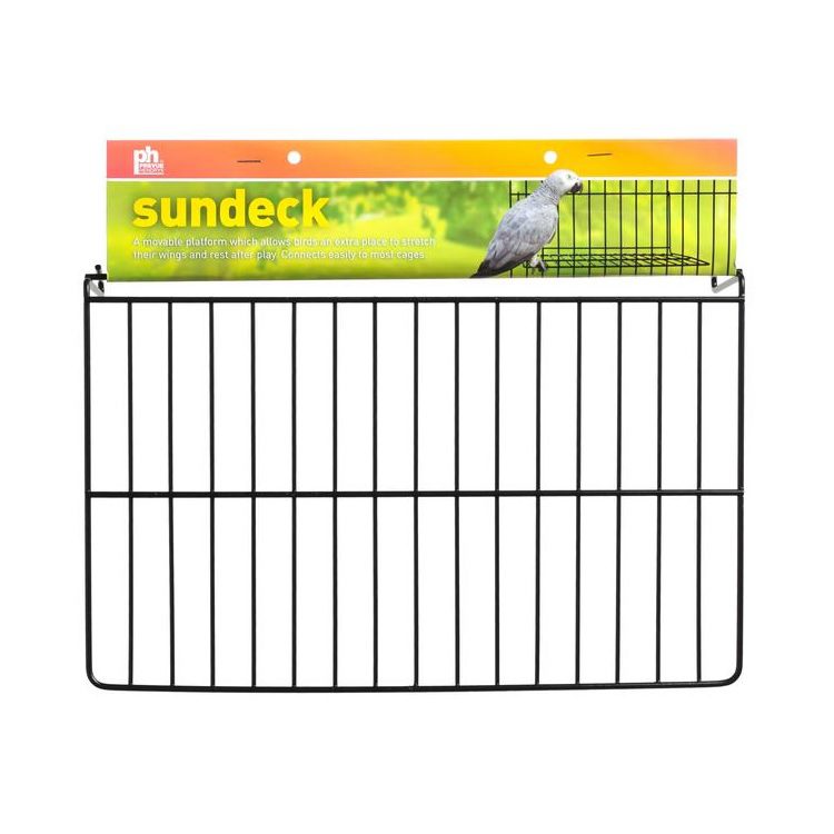 The larger size black metal sundeck is large enough for amazons, smaller cockatoos, African Greys, Eclectus, and similar-sized birds. Can be placed on the inside or the outside of your bird's cage.